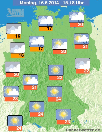 Heute Nachmittag ziehen im Norden gebietsweise dichte Wolken durch, die für einzelne Schauer sorgen können. Ansonsten herrscht aber vielfach freundliches und trockenes Frühsommerwetter und einem Abend beim Public-Viewing steht nicht im Wege. Die Werte liegen insgesamt auch einem angenehmen Niveau zwischen eher frischen 16 Grad entlang der Ems und bis zu 25 Grad im Rhein-Main-Gebiet.