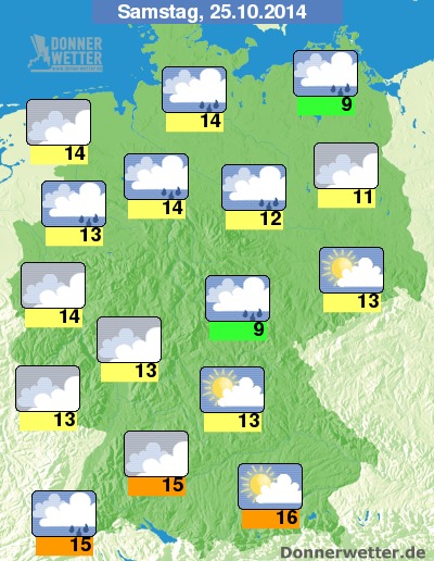 Der Samstag wird insgesamt ein unbeständiger Herbsttag, es ziehen immer wieder dichte Wolken mit gelegentlichem Regen durch, dabei sind aber auch Auflockerungen möglich. Freundlicher und weitgehend trocken ist es zunächst noch im Osten und Süden des Landes, aber auch hier kann es am Nachmittag gebietsweise regnen. Die Temperatur steigt auf 9 Grad am Stettiner Haff und bis 16 Grad in München.