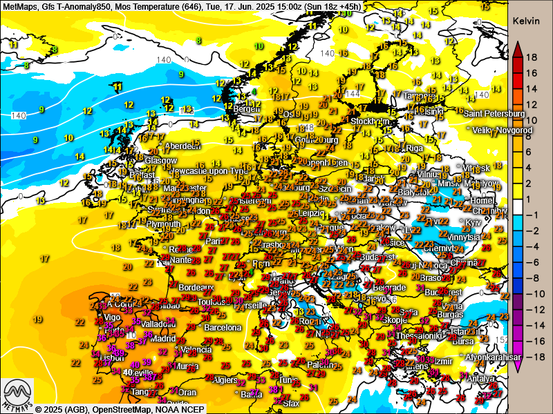 Temperaturen und Temperaturanomalie Dienstag (15:00 Uhr) nach GFS.