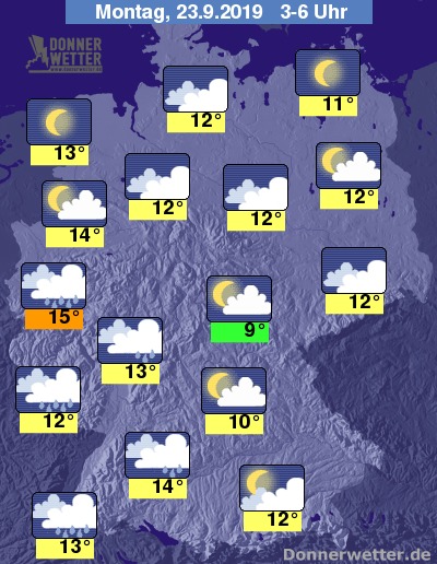 In der Nacht zum Montag ist es anfangs noch verbreitet locker bis aufgelockert bewölkt und vielerorts auch sternenklar. Im Westen und Südwesten verdichten sich die Wolken im Nachtverlauf jedoch immer weiter und etwa ab Mitternacht setzt nachfolgend Regen ein, der bis zum Morgen auch den übrigen Westen und Süden überzieht. Die Temperatur sinkt auf 15 Grad in der Kölner Bucht und bis 9 Grad im Grabfeld.