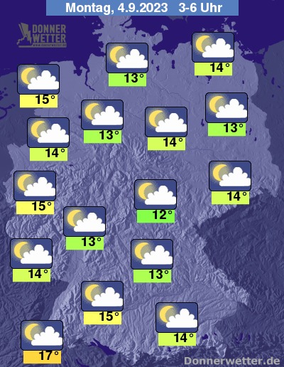 In der Nacht zum Montag ziehen gebietsweise noch einige Wolken durch. Im weiteren Nachtverlauf wird es aber zunehmend auch sternenklar, dazu bleibt es trocken. Die Temperatur sinkt auf 17 Grad in Freiburg und bis 12 Grad in Erfurt.