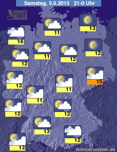 Heute Abend zieht besonders über der Südhälfte von Deutschland häufig starke Bewölkung durch und es kann hier und da regnen. Weiter nach Norden hin ist es hingegen meist leicht bewölkt oder auch sternenklar, nur in den küstennahen Regionen ziehen teils dichte Wolken auf, die zu Schauern und auch einzelnen Gewittern führen, sonst bleibt es jedoch trocken. Im Norden weht ein frischer bis starker, an der Küste ein stürmischer Wind. Die Abendtemperatur liegt bei 15 Grad in Dresden und etwa 11 Grad im Eichsfeld.
