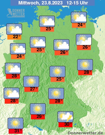 Die Temperaturen erreichen Höchstwerte um 22 bis 24 Grad in Küstennähe und heiße 30 bis 32 Grad im südlichen Bayern und Baden-Württemberg.
