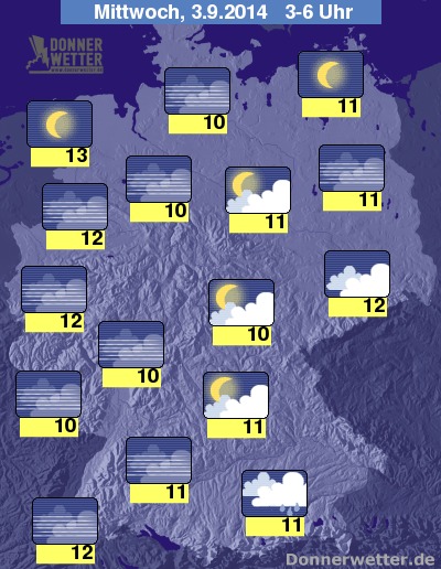 In der Nacht zum Mittwoch fällt im Südosten aus teils dichten Wolken noch zeitweise Regen, ein paar Tropfen sind auch am Erzgebirge noch möglich, sonst ziehen in der Südosthälfte Deutschlands auch immer wieder, teils dichtere Wolken durch, dabei bleibt es aber trocken. Im Norden und Westen bleibt es bis zum Morgen vielfach sternenklar, nur stellenweise kann sich Nebel bilden, dabei bleibt es trocken. Die Temperatur sinkt auf 13 Grad in Ostfriesland und 10 Grad im Westerwald.