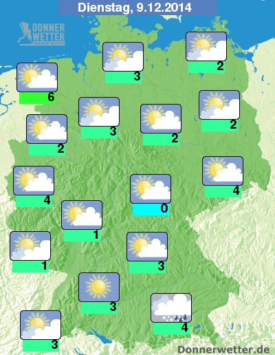 Heute zieht vielerorts lockere bis aufgelockerte Bewölkung durch, zum Teil hält sich aber auch zäher Hochnebel und die Sonne hat es schwer sich einen Weg durch die Wolken zu bahnen, dazu bleibt es verbreitet trocken. Am Alpenrand können dichte Wolken hingegen noch gelegentliche Schneefälle bringen. Die Temperatur steigt auf 0 Grad im Grabfeld und bis 6 Grad in Ostfriesland. An der Nordsee weht dabei zunehmend frischer bis starker, gegen Abend auch teils stürmischer Wind.