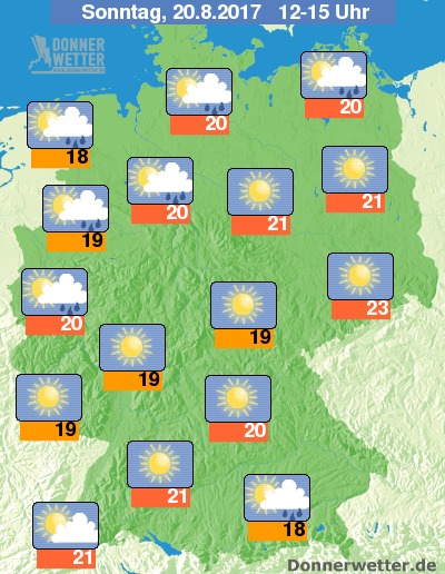 Heute Nachmittag bleibt es über der Südosthälfte Deutschland verbreitet sonnig und trocken, nur im Südosten bringen teils dichte Wolken auch gebietsweise Regenfälle. In den Norden und Westen ziehen häufig einige, nicht selten auch dichte Wolken, dazu bilden sich hier zeitweise Schauer und örtlich auch Gewitter. Die Temperatur liegt bei 18 Grad an der Elbemündung und etwa 23 Grad in der Lausitz.