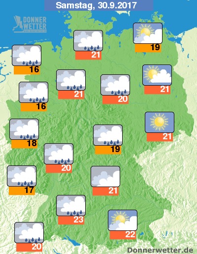 Am Samstag bleibt es nur von Vorpommern, über Berlin-Brandenburg bis nach Sachsen weitgehend heiter bis sonnig und trocken, ansonsten dominieren dichte Wolken den Himmel und es fällt immer wieder, oft auch kräftiger und gewittriger Regen. Die Temperatur liegt bei 16 Grad an der Ems und bis 23 Grad im Raum Stuttgart.