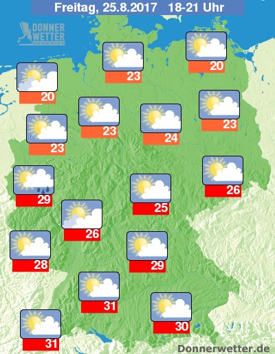 Heute Abend dominiert verbreitet heiteres Wetter mit meist nur leichter Bewölkung, gebietsweise können auch mal mehr Wolken durchziehen. Dichte Wolken und einzelne Schauer oder Gewitter erwarten wir in einem breiten Streifen vom Saarland bis ins südliche NRW, in den übrigen Landesteilen bleibt es weitgehend trocken. Die Temperatur liegt bei 20 Grad an den deutschen Küsten und bis 31 Grad im Oberrheingraben.
