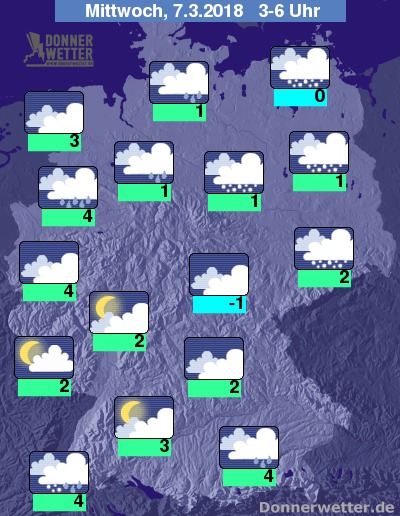 In der Nacht zum Mittwoch verlagern sich die dichten Wolken mit Schnee, Schneeregen und Regen auf die Nordosthälfte Deutschlands, dabei muss verbreitet mit Straßenglätte gerechnet werden! Dichte Wolken mit Regen oder Schnee sind zudem im Alpenvorland möglich, auch hier können die Straßen teils erheblich glatt sein! In den übrigen Landesteilen ist es teils stark, teils aufgelockert bewölkt und größtenteils trocken. Die Temperatur sinkt auf 4 Grad entlang des Rheins und bis etwa -1 Grad im Eichsfeld.