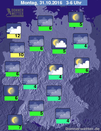 In der folgenden Nacht halten sich vom Emsland bis zum Niederrhein, sowie über Teilen der Mitte Deutschlands gebietsweise dichte Wolken aus denen es gelegentlich auch regnen kann. Im größten Teil der Bundesrepublik zeigt sich der Himmel aber nur leicht bewölkt oder sternenklar und es bleibt dazu trocken. Stellenweise bildet sich jedoch wieder Nebel oder Hochnebel. Die Temperatur sinkt auf 12 Grad in Emden und bsi etwa 3 Grad in Oberfranken.
