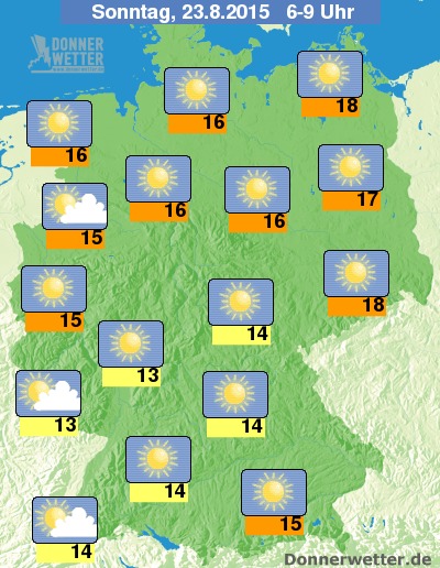 Das Temperaturen erreichen Werte von 13 Grad C im Saarland bis hin zu 18 Grad C in Sachsen.