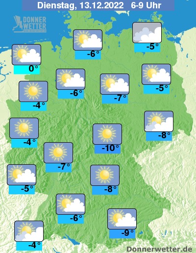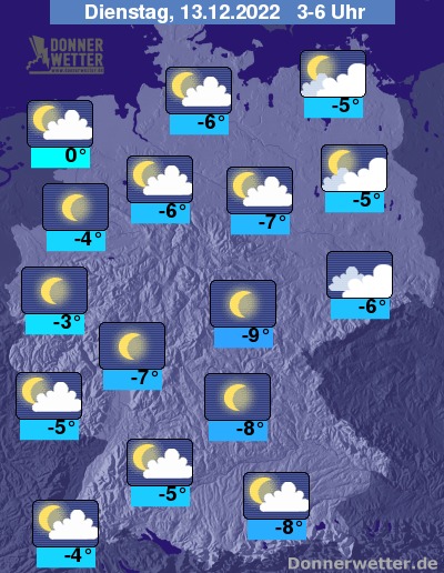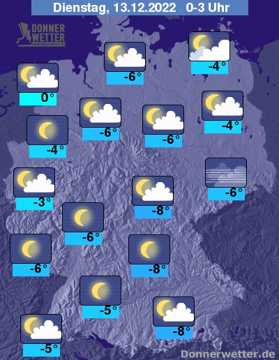 Die Temperaturen gehen auf Werte um 0 bis -9 Grad zurück, in höheren Mittelgebirgslagen sind Tiefstwerte um -12 Grad möglich.