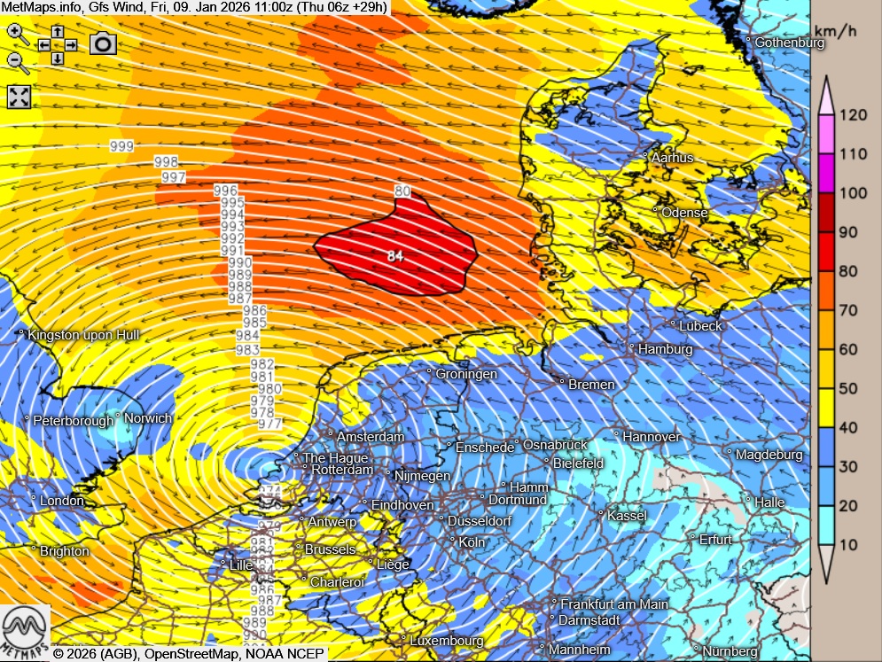 Die Windkarte für Freitagvormittag (11:00 Uhr), sowie die Wetter- / Temperaturkarten für Freitagmorgen (06:00 Uhr) nach GFS: