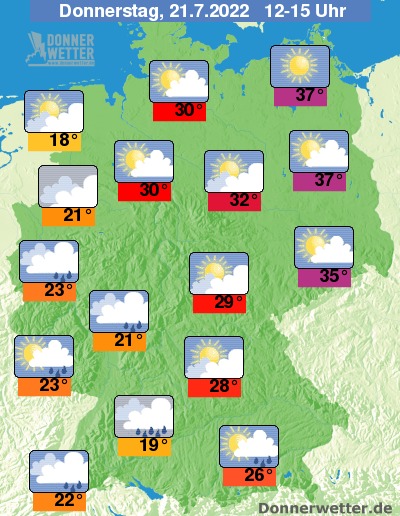 Heute Nachmittag ist es über der Nordosthälfte des Landes meist heiter und dazu trocken. Weiter nach Südwesten hin ziehen dagegen viele und oft dichte Wolken durch und es bilden sich vielerorts Schauer. Zudem bilden sich auch örtliche, teilweise schwere Gewitter. Die Temperatur liegt bei 18 Grad direkt an der Nordsee und bis zu 37 Grad in Berlin.