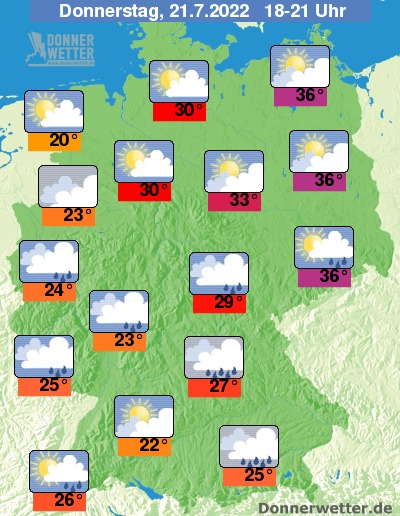 Heute Abend ist es im Norden noch oft locker oder wechselnd bewölkt und dazu trocken. Über die Südhälfte Deutschlands zieht meist starke Bewölkung und es bilden sich verbreitet Schauer, örtlich entwickeln sich auch, teils schwere Gewitter. Im übrigen Land ist es aufgelockert bis stark bewölkt und weitgehend trocken. Die Temperatur liegt bei etwa 20 Grad an der Nordsee und bis zu 36 Grad in der Lausitz.