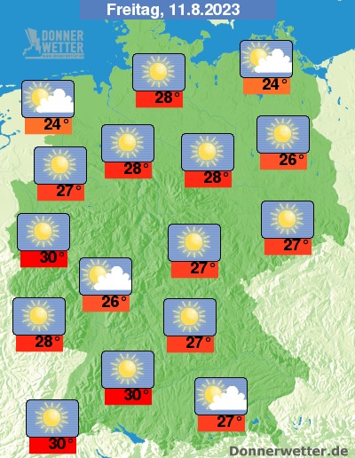 Am Freitag zeigt sich das Wetter überwiegend sonnig, nur hin und wieder ziehen auch mal lockere Wolkenfelder durch. Es bleibt trocken bei Höchstwerten von 24 Grad an der See und bis 30 Grad entlang des Rheins.