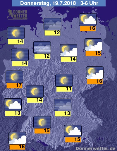 In der Nacht zum Donnerstag zeigt sich der Himmel über weiten Landesteilen sternenklar. Im Osten und Nordosten halten sich aber weiterhin oft einige und vor allem in der ersten Nachthälfte auch noch meist dichte Wolken, dazu bleibt es trocken. Die Temperatur sinkt auf 17 Grad in Bonn und bis 11 Grad im Eichsfeld.