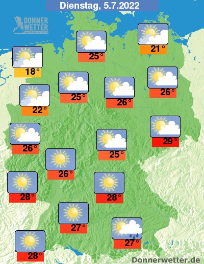 Am Dienstag ist es überwiegend heiter oder sonnig, hier und da ziehen einige Wolkenfelder durch. Im Küstenumfeld und an den Alpen sind zudem lokale Schauer möglich, während es sonst trocken bleibt. Die Temperatur steigt auf 18 Grad an der Nordsee und bis 29 Grad in der Lausitz.