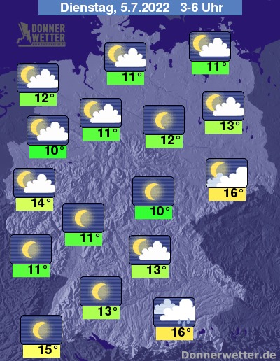In der Nacht zum Dienstag zeigt sich der Himmel über dem Land verbreitet locker bewölkt bis sternenklar. Oft dichte Bewölkung hält sich über Oberbayern, hier fällt auch gebietsweise Regen. Die Temperatur sinkt auf 16 Grad in München und etwa 10 Grad in Meppen.