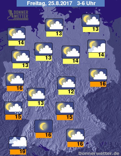 In der Nacht zu Freitag ist der Himmel landesweit meist nur leicht bewölkt und verbreitet funkeln die Sterne. Nur im äußersten Südwesten fallen noch letzte Regentropfen. Die Tiefstwerte liegen zwischen 12 Grad im Thüringer Bergland und knapp 20 Grad in Baden.
