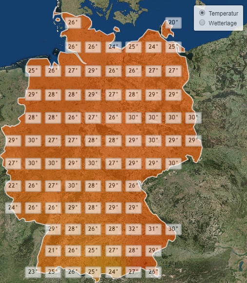 Damit bleibt es vor allem in der Pfalz und im Schwarzwald bereits deutlich kühler als an den vorangegangenen Tagen. Die Höchstwerte liegen hier bei vergleichsweise kühlen 20 bis 25 Grad. Im Rest des Landes werden hingegen wieder bis zu 30 Grad erreicht, in Teilen Bayerns auch bis zu 32 Grad.