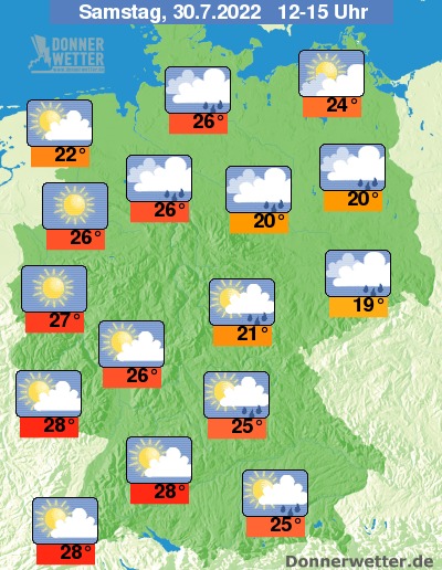 Heute Nachmittag bleibt es über der Nordosthälfte des Landes und über dem östlichen Bayern oft stark, teils aufgelockert bewölkt und es bilden sich vielerorts Schauer, selten auch Gewitter. Im übrigen Land ist es hingegen meist heiter bis sonnig, teils ziehen auch mehr Wolken durch, dabei bleibt es trocken. Die Temperatur liegt bei 19 Grad in der Lausitz und 28 Grad im Breisgau.