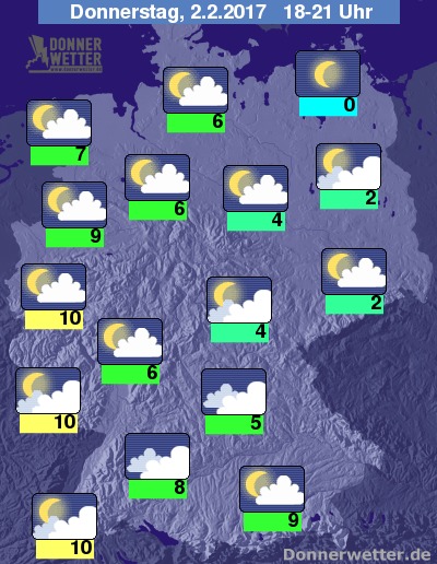 Dabei liegen die Höchstwerte am frühen Abend zwischen kühlen 0 Grad an der Ostsee und bis zu 10 Grad am Rhein.