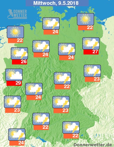 Heiter, nach Süden und Südosten zu auch wolkig. Dabei vor allem über den östlichen Mittelgebirgen sowie allgemein im Süden zunehmende Schauer- und Gewitterneigung. Lokal Gefahr von Starkregen, Hagel und stürmischen Böen. Bei 24 bis 29 Grad verbreitet nochmals warm. An der See sowie südlich der Donau bei Werten mit 22 Grad etwas kühler. Schwacher bis mäßiger, in der Nordosthälfte mitunter leicht böiger Wind aus östlichen Richtungen.