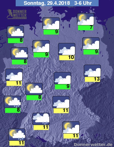 In der kommenden Nacht ziehen im Südwesten dichte Wolken mit Schauern auf, die sich im Verlauf auch auf den übrigen Süden Deutschlands hin ausbreiten. Weiter nach Norden hin ist es auch oft stark, teils aber auch locker bis aufgelockert bewölkt, dazu bleibt es hier trocken. Die Temperatur sinkt auf 13 Grad in Dresden und bis 7 Grad in Neubrandenburg.
