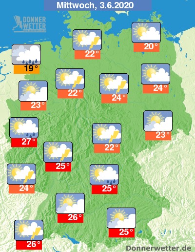 Nach freundlichem Beginn entwickeln sich in der schwüler werdenden Luftmasse immer mehr Quellwolken, die teilweise dunkler und bedrohlicher werden und Regengüsse und Gewitter produzieren können. Dabei besteht örtlich die Gefahr von Unwettern mit Starkregen, Hagelschlag, sowie stürmischen Böen. Bei kräftigen Schauern muss auch stellenweise mit kleinräumigen Überschwemmungen gerechnet werden. Wahrscheinlich trocken bleibt es nordöstlich der Elbe, sowie im südlichen Bayern.