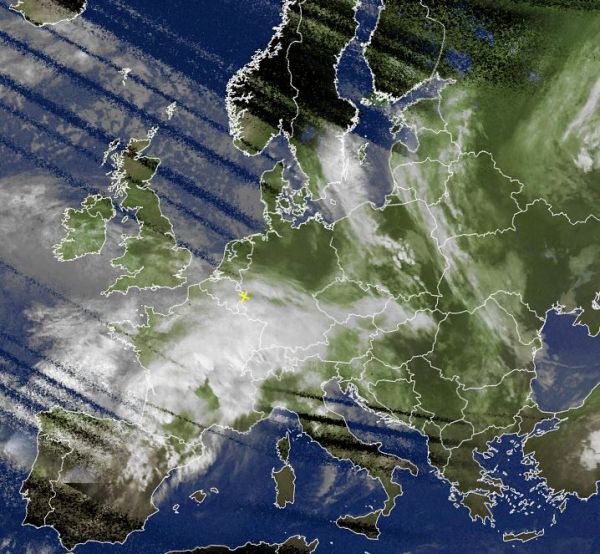 Auf dem Satellitenbild von heute Morgen erkennen wir die kompakten Regenwolken über Frankreich. Sie gehören zu einem Tief westlich der Biskaya und brachten insbesondere in Frankreich oft kräftige und ergiebige, teils auch gewittrige Niederschläge. Auch über Süddeutschland herrscht unter den dichten Wolken verbreitet sehr regnerisches Wetter mit langanhaltendem und teils ergiebigem Regen.