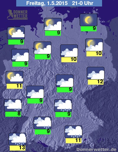 Heute Abend fällt im Süden des Landes unter kompakten Wolken verbreitet, teils langanhaltender und auch ergiebiger Regen. Über der breiten Mitte ist es meist stark, vor allem nach Westen hin aber auch aufgelockert bewölkt und dazu trocken. Im Norden zeigt sich der Himmel meistens locker oder aufgelockert bewölkt, im Ostseeumfeld auch oft sternenklar, dabei bleibt es ebenfalls trocken. Die Abendtemperatur liegt bei 13 Grad in Freiburg und 8 Grad am Pfälzer Wald.