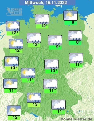 Am Mittwoch bleibt es über der Nordosthälfte Deutschlands bedeckt und es fällt gebietsweise Regen. Im übrigen Land ist es wechselnd oder stark bewölkt, dabei sind einzelne Schauer möglich. Die Temperatur steigt auf kühle 8 Grad in Vorpommern und bis 13 Grad in Schwaben. An der See weht ein oft stürmischer Wind.