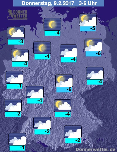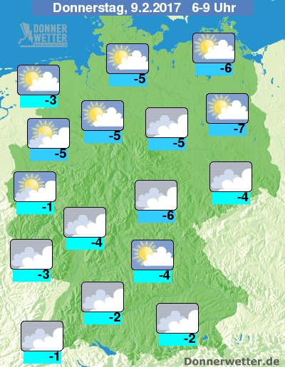 Die Tiefsttemperatur liegt am Morgen um minus 7 Grad C in Frankfurt an der Oder und die Höchsttemperatur um minus 1 Grad C im Westen bei Bonn.