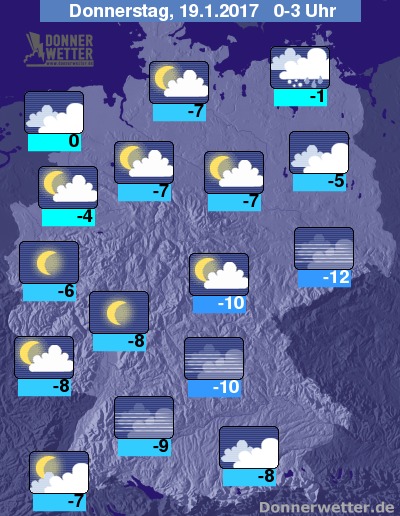 In der Nacht erwartet uns wieder Frost und eisige Kälte: Bis zu minus 13 Grad erwarten wir im Osten beim Erzgebirge. Auch im Südosten sinken die Temperaturen weitestgehend auf unter minus 10 Grad C. Die Höchsttemperatur liegt diese Nacht um 0 Grad C im Emsland.