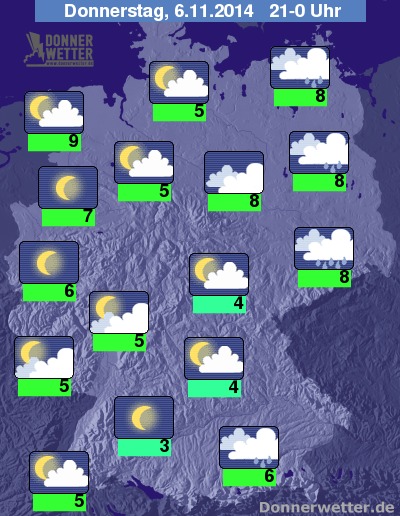 Heute Abend lockert der Himmel von Westen her weiter auf, nach Osten hin kann jedoch noch gebietsweise Regen fallen, sonst ist es dagegen meist nur locker bewölkt oder auch sternenklar und es bleibt trocken. Regional kann sich Nebel oder Hochnebel bilden. Die Abendtemperatur liegt bei 9 Grad in Oldenburg und etwa 3 Grad an der Schwäbischen Alb.
