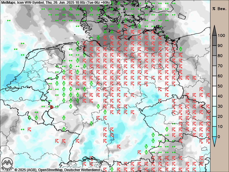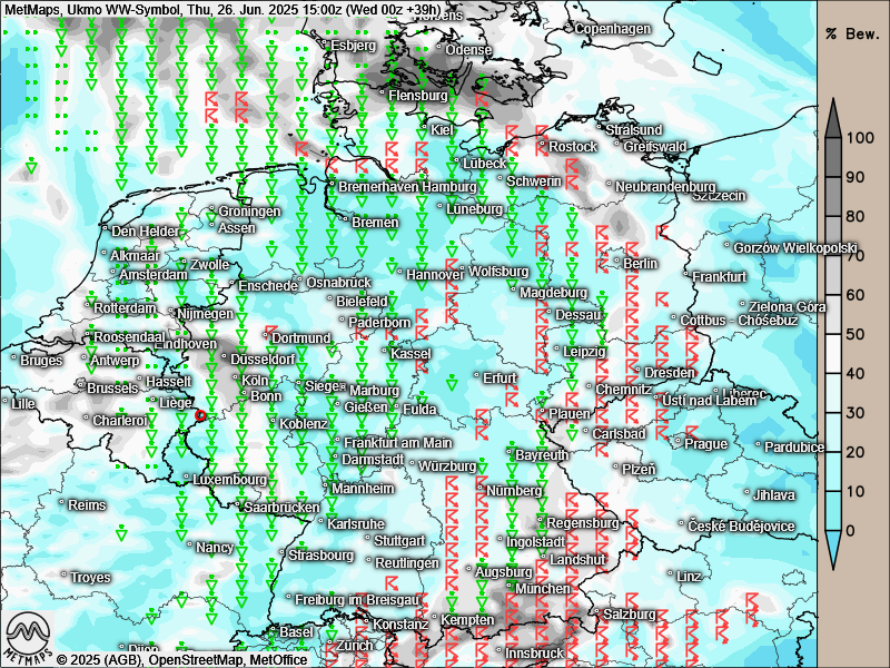 Die Wetter- und Temperaturkarten mit Gewittern (rote Symbole) und Niederschlag (grüne Symbole) für Donnerstagnachmittag (15:00 Uhr) sowie für den frühen Donnerstagabend (18:00 Uhr) nach ICON/UKMO: