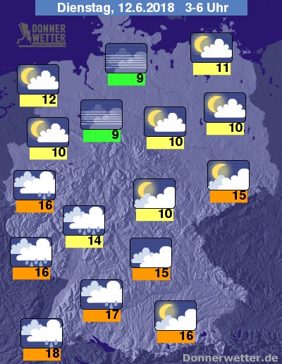 In der folgenden Nacht ist es über der Nordhälfte des Landes meist locker, hier und da auch mal stärker bewölkt, aber trocken. Dichte Wolken halten sich dagen über dem Süden und Westen Deutschlands, hierbei bilden sich verbreitet auch Schauer und teils kräftige Gewitter. Die Temperatur sinkt auf 18 Grad in Freiburg und bis 9 Grad in der Norddeutschen Tiefebene.