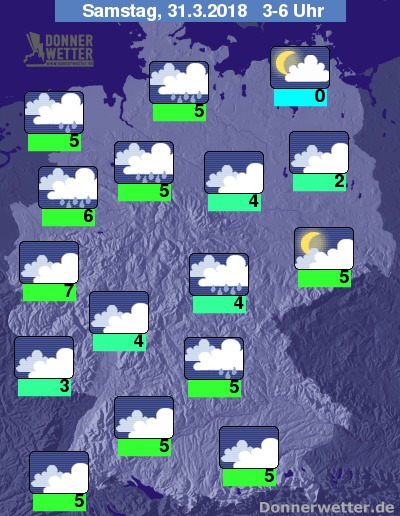 In der folgenden Nacht breiten sich kompakte Regenwolken von Südwesten und dem Westen her weiter nordostwärts aus und erreichen bis zum Morgen auch den Norden und die Mitte des Landes, auch im Süden fällt unter dichten Wolken gebietsweise Regen. Trocken, jedoch meist stark bewölkt bleibt es im Osten und Nordosten der Republik. Die Temperatur sinkt auf 7 Grad in Bonn und etwa 0 Grad in Neubrandenburg.