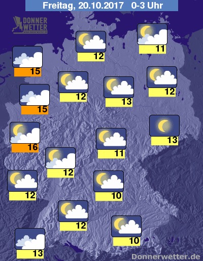 Dabei fallen die Temperaturen bis zum frühen Morgen auf Werte um die 10 Grad in weiten Teilen Bayerns und auf rund 15 Grad am Niederrhein.
