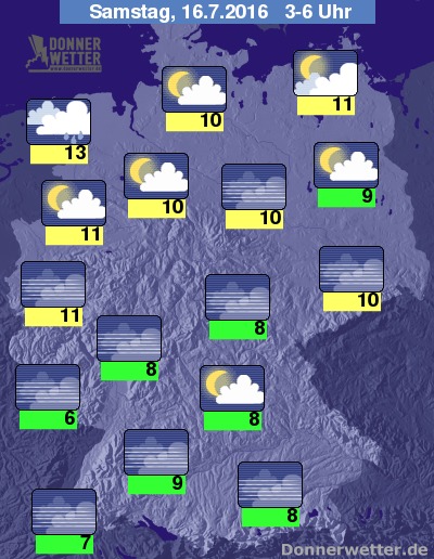 In der Nacht zum Samstag ist es über der Südhälfte verbreitet sternenklar oder nur locker bewölkt und dabei trocken. Auch sonst ist es zunächst meist locker bewölkt, jedoch ziehen zum Morgen hin im Nordwesten dichte Wolken mit Regen herein, sonst bleibt es aber trocken. Die Temperatur sinkt auf 13 Grad in Ostfriesland und 6 Grad im Saargau.