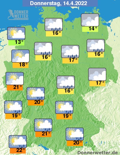 Am Donnerstag zeigt sich der Süden noch meist heiter und trocken, sonst ist es aber überwiegend stark, teils ist es aufgelockert bewölkt. Es bilden sich lokale Schauer, selten entwickeln sich auch Gewitter. Die Temperatur steigt auf 13 Grad in Aurich und bis 22 Grad in Freiburg.