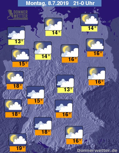 Am späteren Abend bleibt der Himmel in der Mitte und im äußersten Nordwesten bedeckt, sonst ist es teils locker, teils aufgelockert bewölkt. Mit Niederschlägen muss meist nicht mehr gerechnet werden.
