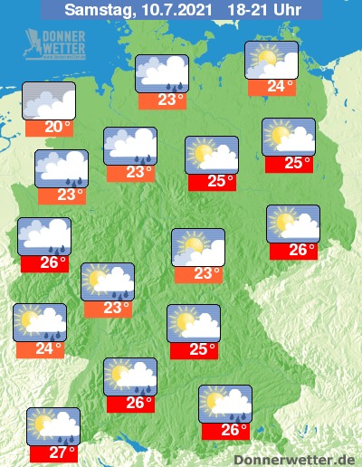 Heute Abend ziehen über die Westhälfte Deutschlands häufig dichte Wolken hinweg, dabei sind vielerorts Schauer und örtlich auch Gewitter möglich. Weiter nach Osten hin ist es meist gering bis wechselnd bewölkt und dazu weitgehend trocken. Die Temperatur liegt bei etwa 20 Grad in Cuxhaven und bis zu 27 Grad in Freiburg.