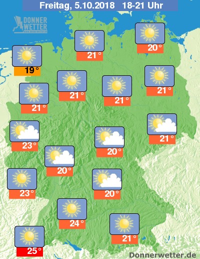 Am frühen Abend kann man verbreitet noch wärmespendende Strahlen der untergehenden Sonne genießen. Dazu präsentiert sich der Himmel oft wolkenlos oder nur leicht bewölkt. Vor der Dämmerung werden häufig noch Werte von 20 Grad oder mehr gemessen. Am Kaiserstuhl sind anfangs auch noch bis zu 25 Grad möglich.