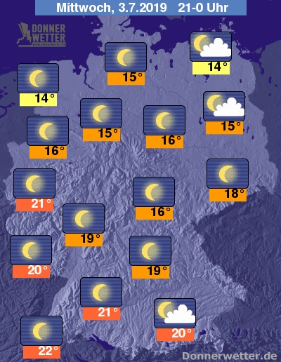 Die Temperaturen liegen im Norden und Osten am frühen Abend bei 16 bis 21 Grad, im Süden und Südwesten werden noch angenehme 21 bis 27 Grad erreicht.