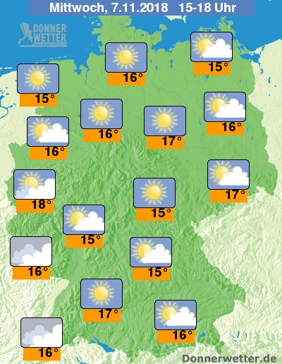 Am frühen Nachmittag präsentiert sich der Himmel über Deutschland mit Ausnahme einiger Gebiete mit Nebel oder dichterer tiefhängender Wolken oft heiter oder nur leicht bis mäßig bewölkt. Mit sonniger Unterstützung, sowie einem leichten bis mäßigen Süd- bis Südwestwind klettern die Temperaturen wieder auf angenehm milde 14 bis 18 Grad.