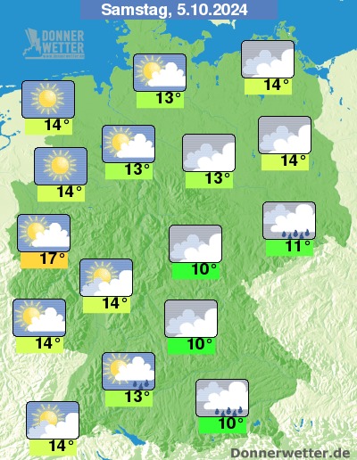 Am Samstag scheint vor allem über der Westhälfte häufig die Sonne bei meist nur lockeren Wolkenfeldern, dabei bleibt es trocken. Im Süden, Südosten, Osten und Nordosten ist es hingegen meist stark bewölkt oder trüb und vom Süden bis nach Sachsen können sich einzelne Schauer bilden, sonst bleibt es trocken. Die Temperatur steigt auf 10 Grad in Oberbayern und bis 17 Grad im Rheinland.
