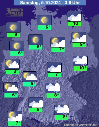 In der Nacht zum Samstag bleibt es im Süden, Südosten und Osten weiterhin dicht bewölkt und vor allem über Bayern, aber auch über Sachsen fällt zeitweise Regen oder es bilden sich Schauer. Im Südwesten ist es aufgelockert bis stark bewölkt und weitgehend trocken. Im übrigen Land ist der Himmel meist sternenklar oder nur locker bewölkt, dazu bleibt es trocken. Die Tiefstwerte liegen bei 10 Grad auf Rügen und etwa 5 Grad am Westerwald.