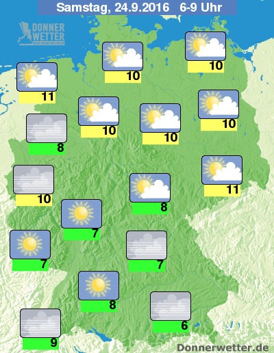 Entlang der Donau und zwischen Niederrhein und Emsland beginnt der Samstag vielfach nebelig, in den restlichen Landesteilen gibt es am Morgen bereits viel Sonnenschein und einzelne harmlose Wolkenfelder.